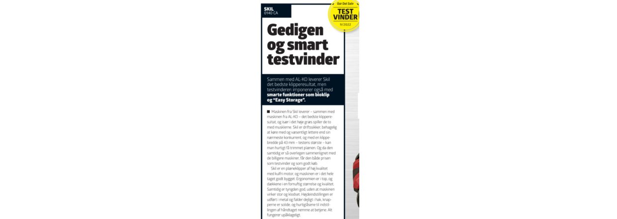 Maskinen fra Skil leverer – sammen med maskinen fra AL-KO – det bedste klippe resultat, og især i det høje græs spiller de to med musklerne. Skil er driftssikker, behagelig at køre med og væsentligt lettere end sin nærmeste konkurrent, og med en klippe bredde på 43 mm – testens største – kan man hurtigt få trimmet plænen. Og da den samtidig er så overlegen sammenlignet med de billigere maskiner, får den både prisen som testvinder og som godt køb. Skil er en plæneklipper af høj kvalitet med kulfri motor, og maskinen er i det hele taget godt bygget: Ergonomien er i top, og dækkene i en fornuftig størrelse og kvalitet. Samtidig er tyngden god, uden at maskinen virker stor og klodset. Højdeindstillingen er udført i metal og falder dejligt i hak, knapperne er solide, og hurtiglåsene til indstillingen af håndtaget nemme at betjene. Alt fungerer upåklageligt.