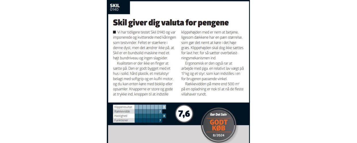 NU igen i 2024 vinder SKIL titlen som GODT KØB. SKIL 0140 akku plæneklipper er med 2x20V batterier og en stærk kulfri motpor med 5 års garanti. GDS bladet kalder SKIL 0140 for en BUND SOLID maskine. Maskinen er godt bygget og med en nem højde justering.