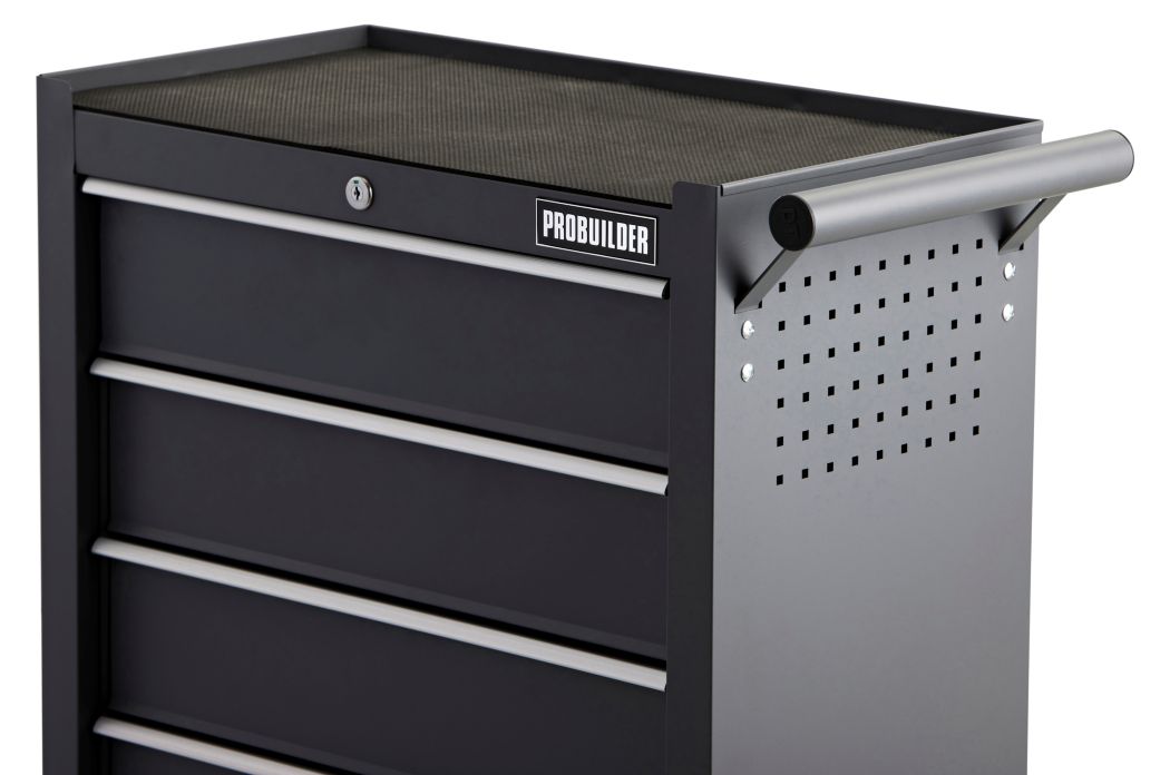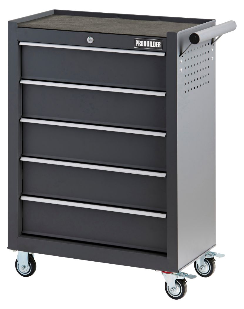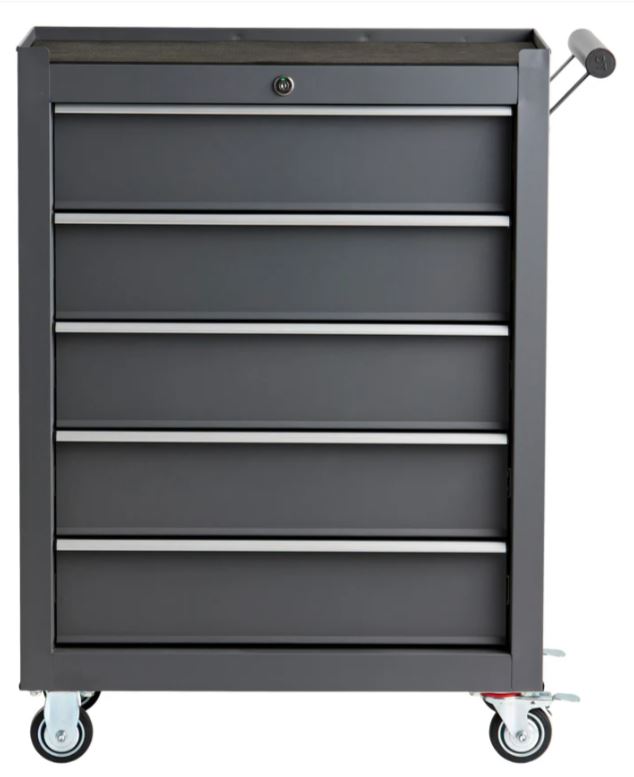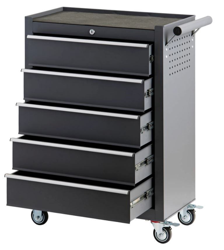 615 x 330 x 850mm Praktisk værktøjsvogn med 5 skuffer Skuffernes størrelse: 510 x 300 x 120 mm Låsbare skuffer inkl. 2 nøgler Skridsikker EVA-måtte i hver skuffe 850 mm arbejdshøjde Eva-måtte på toppen 75 mm hjul, 2 låsbare Inkl. 5 stk. kroge til ophængning af værktøj.