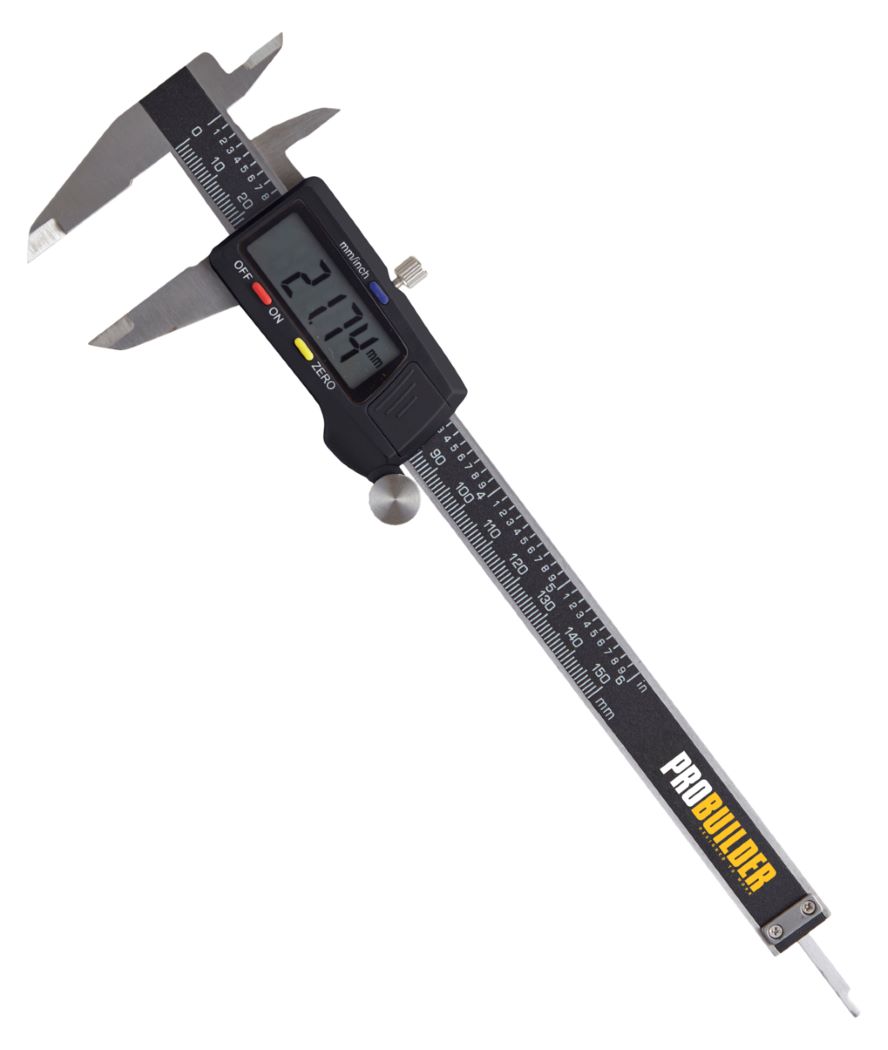 Skydelærer med LCD-display, perfekt til de små præcise mål. Enheden kan måle tykkelse, dybder og diameter, både i metrisk og tommer.