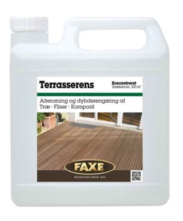 FAXE Terrasserens Koncentreret er egnet til rengøring af terrasse belægninger lavet af ubehandlet eller olieret træ, sten eller komposit materiale. FAXE Terrasserens Koncentreret fjerner snavs og belægninger. Ved anvendelse af en skrubbe med stive børster går rengøringen meget hurtigt og effektivt, også ved profilerede overflader. FAXE Terrasserens Koncentreret beskadiger ikke tilgrænsende beplantninger.