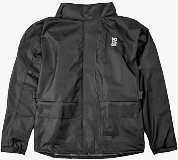 Waterproof polyester jacket with pockets, resealable hood and several adjustments.