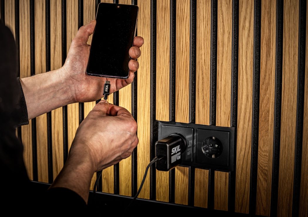 Multifunktionel 45W Power Delivery (PD)-oplader, der kan bruges til opladning af både PWRASSIST™ USB-C-kompatible SKIL-batterier og mobilenheder
