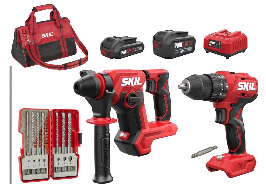 Emballagen indeholder SKIL 3021 børsteløs batteridrevet slagboremaskine SKIL 3821 børsteløs batteridrevet borehammer Batteri 'PWRCORE 20™' 4.0Ah 'KEEPCOOL™' Li-ion (3104) Batteri 'PWRCORE 20™' 2.0Ah 'KEEPCOOL™' Li-ion (3107) Oplader (3122) Transporttaske Dobbeltendet skruetrækkerbit Sidehåndtag Dybdeanslag Sæt med 7 SDS+ bor: 5mm, 6mm (2x), 8mm (2x), 10mm, 12mm Brugsanvisninger