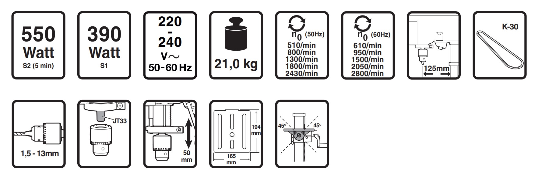 Effektiv 550 watt kulfri induktionsmotor. Fem hastighedsindstillinger til boring i forskellige materialer. Krydslinjelaser viser det præcise boreområde. LED-arbejdslampe giver optimal synlighed, også i svagt oplyste områder. Justerbart arbejdsbord inklusive ekstra skruestik til sikker fastspænding af arbejdsemnet.